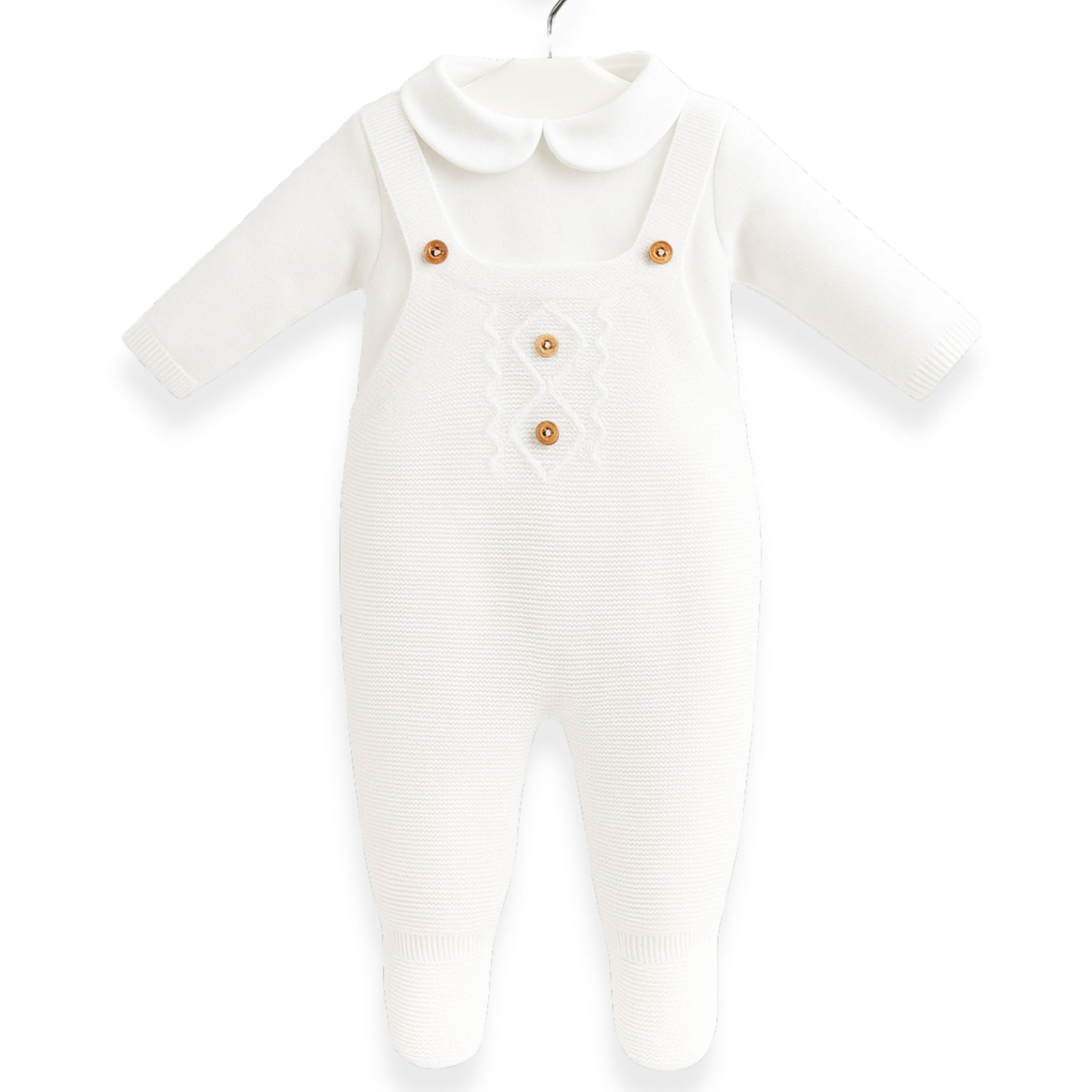 A staple piece for your baby's Autumn/Winter wardrobe! This white two piece outfit consists of knitted dungarees with striped feet - traditional, timless and cute! A matching knitted collared jumper to wear underneith, with embroidered detailing. The traditional woven cable design and brown buttons are beautiful added details - it's a must have for your little one.