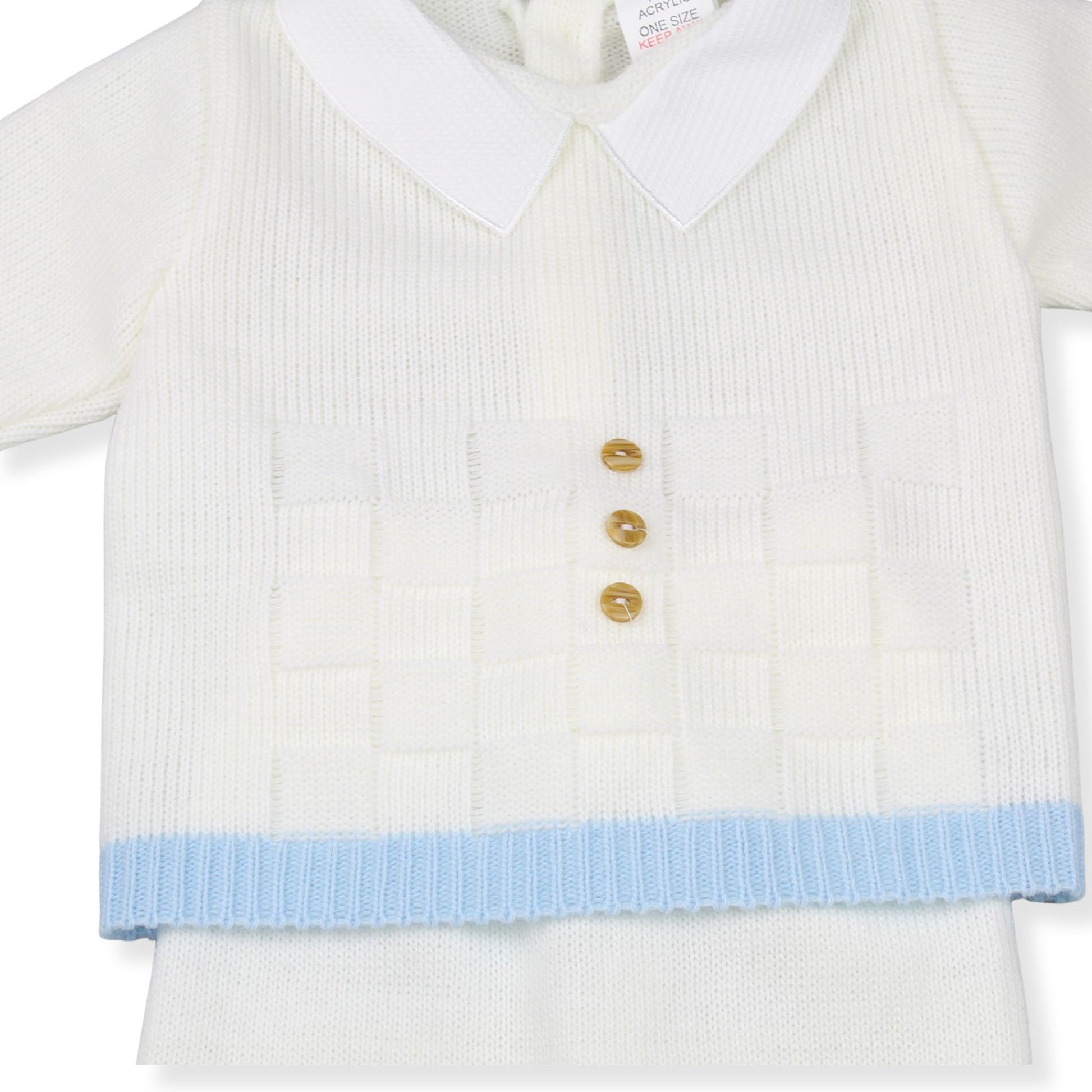 This lovely white and blue three-piece knitted set is made in Portugal using soft, quality yarn for a comfortable fit. The outfit includes a long-sleeved knitted top with a white collar and textured front panel, matching footed trousers, and a coordinating hat.