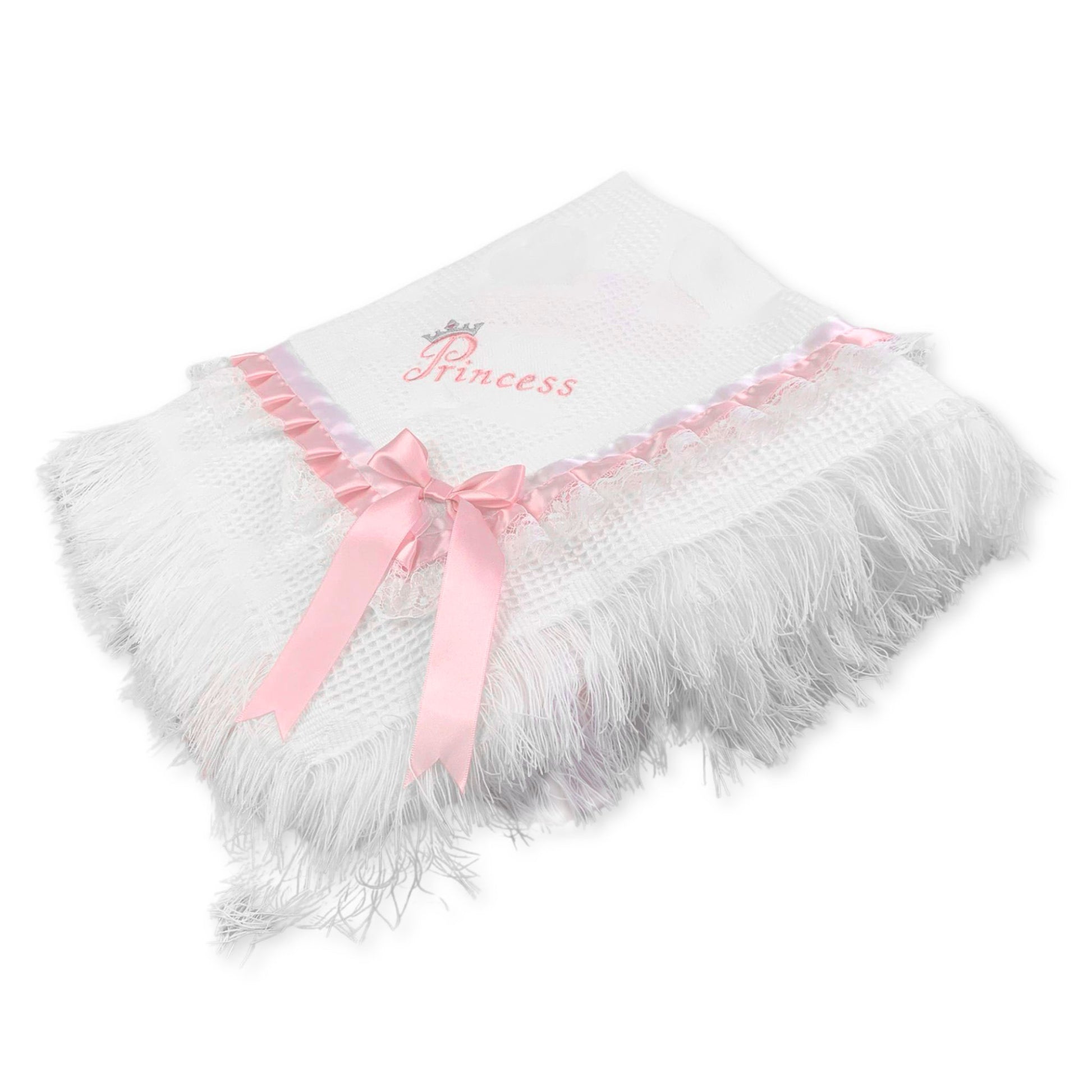 Measuring a generous 120cm x 120cm, this shawl offers ample coverage, ideal for draping over your baby girl during her most memorable moments. The word “Princess” is elegantly embroidered in one corner, complete with a delicate silver crown above the first letter, adding a regal touch to the shawl’s design. It’s further enhanced by pleated pink satin ribbon, which wraps gracefully across the shawl, and is complemented by a beautiful ruffled lace trim that adds a soft, feminine detail. To complete the look, four pink satin bows are delicately placed in each corner, with elegant fringed edges giving the shawl an extra layer of sophistication.